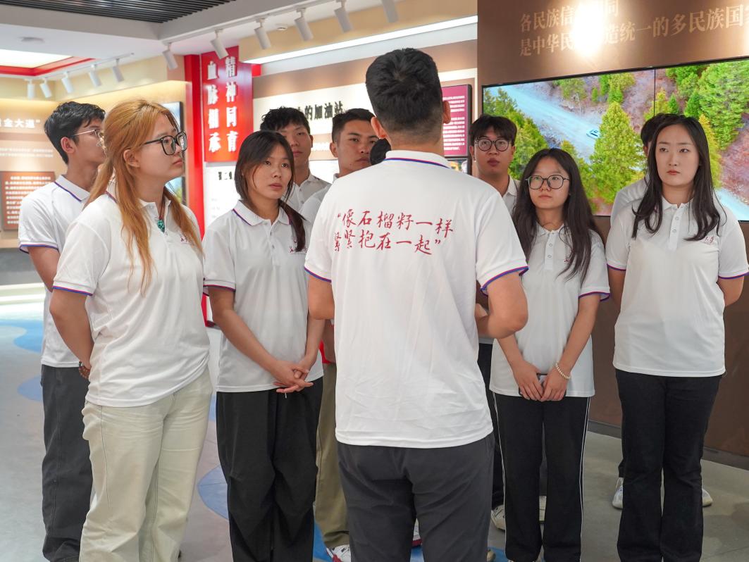 在卓尼縣鑄牢中華民族共同體意識主題教育實踐館,實踐隊開展了系統的參觀學習。實踐隊指導老師田啟良擔任本次參觀的講解員,他從歷史維度深入剖析,為隊員們講解了卓尼地區各民族交往交流交融的悠久歷史和生動實踐。從紅軍長征途經卓尼播撒民族團結火種,到新時代脫貧攻堅、鄉村振興進程中各族群眾共同團結奮斗、共同繁榮發展;從協同推進生態保護與綠色發展,到多元文化交融共筑精神家園,實踐隊全面了解了卓尼縣依托“五大文化”,將鑄牢中華民族共同體意識深度融入縣域發展全過程,著力打造新時代民族團結進步“高地”的寶貴“卓尼經驗”。這些鮮活的實例與故事,成為隊員們深入理解“鑄牢中華民族共同體意識”內涵意蘊的“行走教科書”,有效激發了新時代各青年學子投身于民族復興偉業的責任感與使命感。