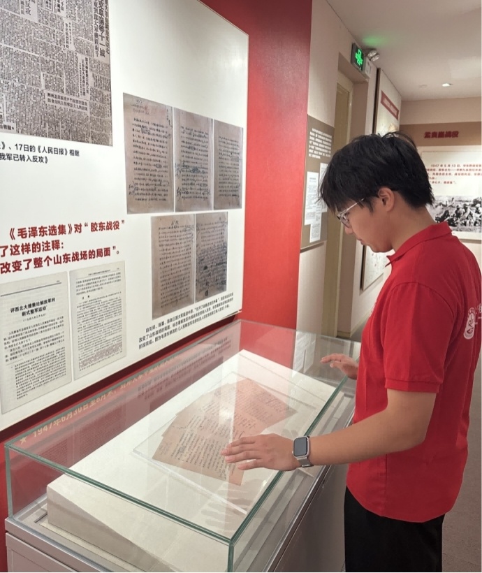 從泛黃的歷史照片到銹跡斑斑的武器,從珍貴的手稿到復(fù)原的革命場(chǎng)景,每一件展品都仿佛在訴說(shuō)著膠東人民為民族獨(dú)立和人民解放所做出的巨大犧牲與卓越貢獻(xiàn)。每一處細(xì)節(jié)都讓成員們感受到歷史的厚重與革命先烈的偉大。在“英雄膠東”展區(qū),實(shí)踐團(tuán)成員駐足于“馬石山十勇士”的展板前,被勇士們?cè)诜榛疬B天中為保護(hù)群眾與敵人殊死搏斗、壯烈犧牲的精神深深震撼。講解員動(dòng)情地講述著那段歷史,成員們仿佛穿越時(shí)空,回到了那個(gè)戰(zhàn)火紛飛的年代,感受到了革命先烈們堅(jiān)定的信仰與無(wú)畏的勇氣。