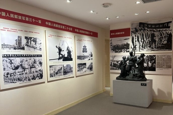 在“英雄膠東”展區(qū),成員們駐足于“馬石山十勇士”展板前,被勇士們?cè)诜榛疬B"/>
