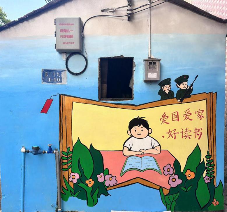 親子攜手繪丹心,筆墨同書家國情 實踐隊以“愛國愛家好讀書”為主題,開展親子墻繪活動,創新采用“3+1”協作模式(親子家庭、繪畫愛好者、社區志愿者+實踐隊)。孩子們與家長攜手執筆,實踐隊員在旁提供專業技法指導與色彩調配協助,各方分工協作,共同為河村“家國書香紅色文化墻”注入鮮活生命力。這種多方參與的創作模式,既發揮了高校學子的專業優勢,又激發了居民參與鄉村建設的內生動力,讓藝術真正成為美化鄉村環境和推動文化振興的紐帶。