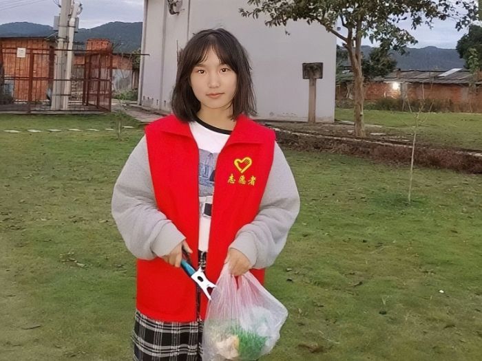 圖為實踐團成員張瑞蓮在社區清理草地垃圾。張瑞蓮 供圖