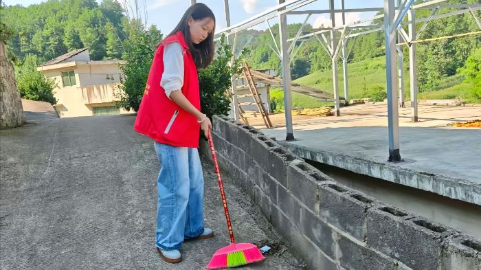 圖為實踐團成員楊彩綾用掃帚清掃巷道墻邊垃圾。楊彩綾 供圖