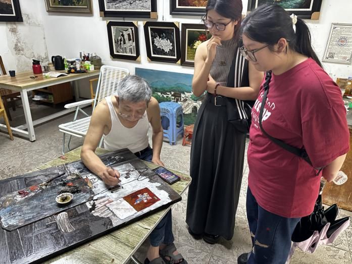 7 月 2 日,團(tuán)隊(duì)拜訪了年逾古稀的漆畫匠人鄭崇堯先生的工作室。鄭老指尖摩挲著未完工的漆畫,向隊(duì)員們細(xì)述大漆秉性:“漆如君子,有傲骨亦需馴養(yǎng)。每一層髹涂都是與自然的對(duì)話,每一次打磨都是與材料的交流。”