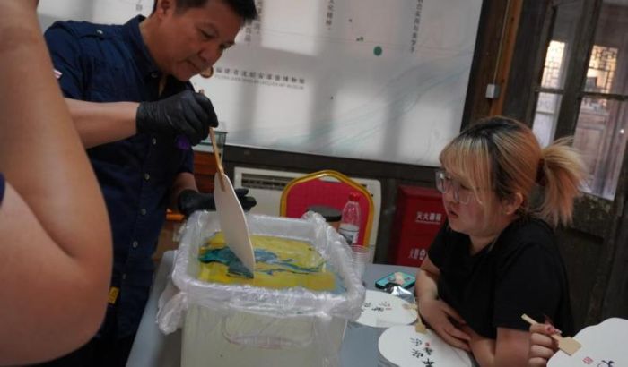 7月3日,實(shí)踐團(tuán)來到福州漆藝基地,在濃郁的漆香中探尋手藝人的堅(jiān)守與憂思。作坊里,鄭文姜師傅正用細(xì)筆勾線,談及自己的漆畫《武夷晨霧》在國際上獲得贊譽(yù)時(shí),他眼中閃爍著驕傲的光芒。但提及傳承困境,鄭師傅不禁蹙眉:“學(xué)這行先要熬過‘漆瘡’,年輕人很難堅(jiān)持;天然顏料成本高,售價(jià)高了沒人買,低了又要虧本。”