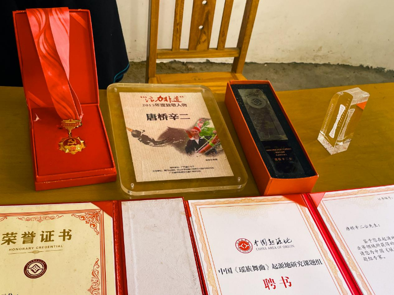 “這個是我們縣文化局舉辦的長鼓舞大賽,五次了,五次都是我們隊伍拿第一!”老人指著放在桌上的榮譽,自豪之情溢于言表。他向我們回憶道,更讓他難忘的是1991年中秋,他親自帶領舞團登上北京圓明園的舞臺,讓瑤族鼓聲響徹京都。不僅如此,他還作為中華優秀傳統文化的使者,將瑤韻帶出國門,“阿公還應邀去新加坡表演過呢。”家人的補充。印證了唐橋辛二公藝術造詣的廣泛認可。