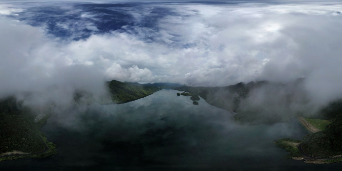 (圖為無人機(jī)拍攝下云霧繚繞的板洞水庫。麥嘉豪 攝)