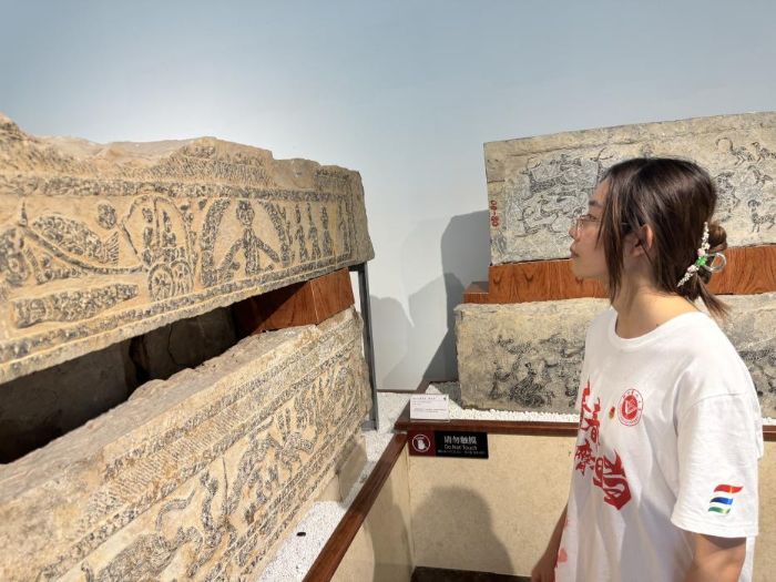 步入徐州漢畫像石藝術館,實踐團成員沉浸式體驗了漢代石刻藝術的精妙絕倫。館內珍藏了千余塊漢畫像石,有的展現車馬儀仗的恢弘氣勢,有的記錄宴飲樂舞的生動場景,栩栩如生地呈現了漢代社會的精神風貌。"這些石刻就像是漢代社會的百科全書",實踐團成員表示,"通過神話傳說、日常生活等不同主題的展區,我們得以穿越時空,直觀感受漢代先民的生活智慧與藝術造詣。"