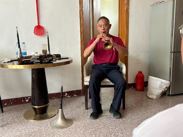 訪談深入后,李偉展示銅質嗩吶的哨片、桿身、喇叭口等部件,強調“哨片是靈魂”——需以蘆葦手工精制,經十余道工序,考驗匠人耐心與悟性。他憶及學藝歷程:自幼隨父研習,“冬練三九強氣息,夏練三伏熟指法”,終成當地名家。談及往昔樂隊伙伴,他難掩悵然:“社會發展快,單靠演奏難維生計,老伙計多已轉行,合奏盛景成追憶。”提及鮮少有人愿沉心學藝,其眼中惋惜更顯傳統技藝傳承之艱。