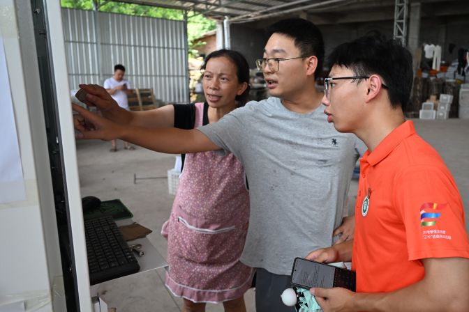駐錦屏鎮果蔬專家工作站成員向團隊介紹分揀與預冷系統。楊佳奇 供圖
