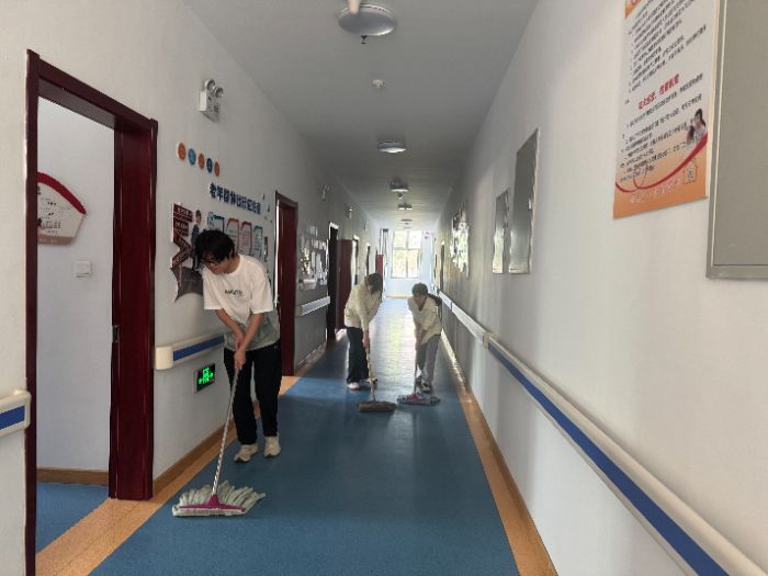 實踐活動期間,實踐團成員對于老人們生活環境的衛生情況也十分重視,在隊長的安排下迅速地開始了衛生清掃工作。分工合作,默契配合,有的負責清掃老人理發后的頭發,有的負責拖地。實踐團成員們不放過死角,確保養老院的整潔與衛生,為老人創造一個整潔舒適的生活環境。