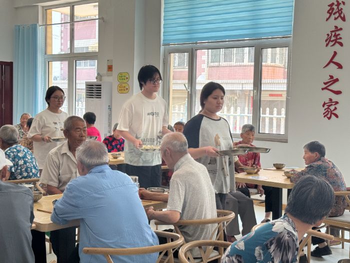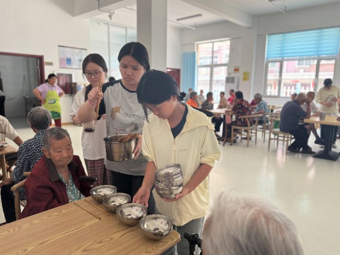 隨著實踐活動的進行,實踐團成員為老人做好水餃并從廚房將一盤盤餃子端至老人面前,他們穿梭與餐桌間,細心的擺放碗筷,體貼的為口味偏好的老人添加香醋,等老人們午飯結束后,再將碗筷收好,清洗后放回。