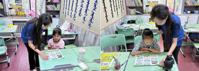 團隊成員、英語專業學生伊麗姆努爾·賽伊布拉深有感觸:“當維吾爾族小朋友用標準的普通話喊出‘我們是祖國的花朵’時,我深刻感受到語言文字不僅是溝通的橋梁,更是鑄牢中華民族共同體意識的紐帶。”圖為隊員在包頭社區與孩子們互動教學。