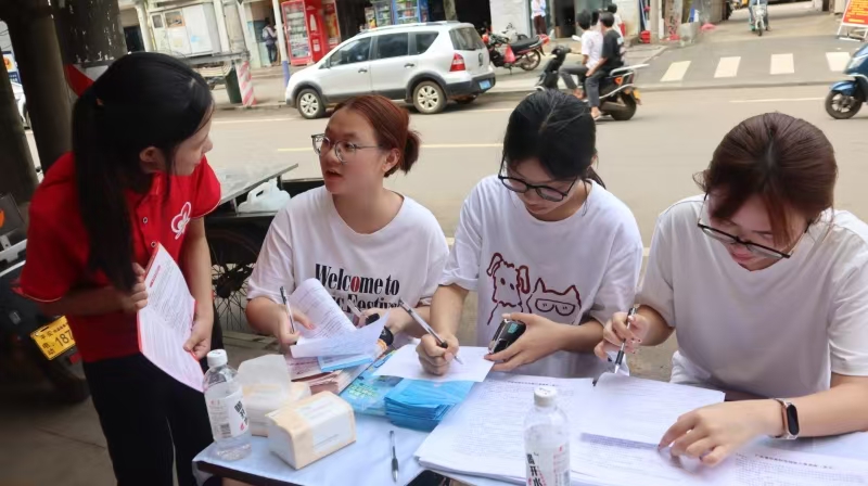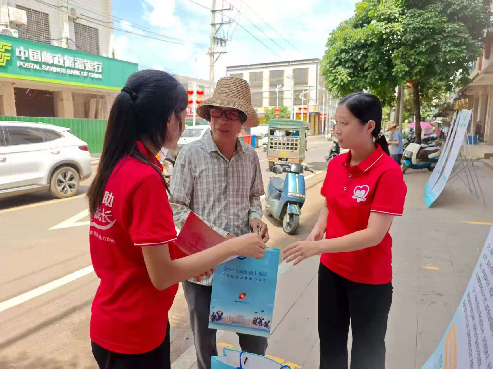雙向奔赴:青春力量的匯聚7月14日,團(tuán)隊(duì)在和安鎮(zhèn)農(nóng)信社設(shè)置資助政策宣傳咨詢(xún)點(diǎn)。原本計(jì)劃著隊(duì)員們“單兵作戰(zhàn)”,卻在活動(dòng)現(xiàn)場(chǎng),迎來(lái)了意外又溫暖的“援軍”——前一天入戶(hù)宣講結(jié)識(shí)的準(zhǔn)大學(xué)生們,主動(dòng)從家里趕來(lái),加入宣傳隊(duì)伍!