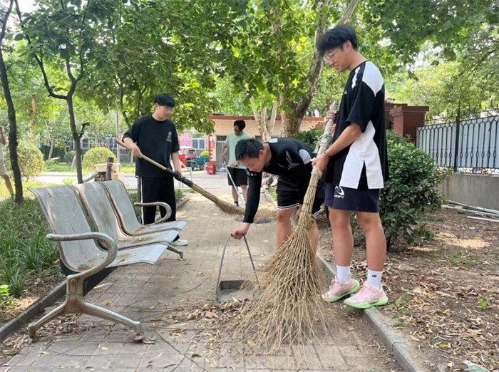 夏日時節,院內枝葉繁茂,偶有殘葉飄落,實踐團成員迅速拿起工具,兩兩一組,一人掃一人收。盡管烈日炎炎,仍干勁十足,很快將殘葉聚成小堆打掃干凈,在實踐團成員的努力下,地面變得整潔,為老人營造了舒適的室外空間。