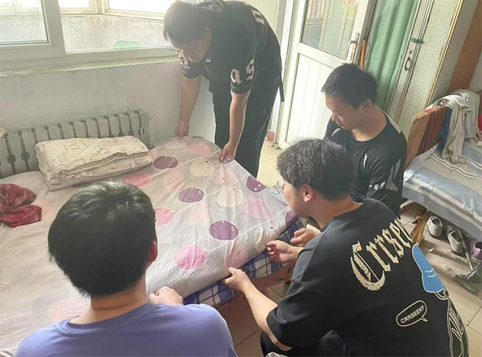 交流結束后,實踐團成員得知老人們日常整理床鋪吃力,便自發分工。大家輕步邁入老人房間,先小心把床上舊被輕柔卷起,將新床單抖開,仔細鋪展、掖好邊角。夏日陽光透過窗欞,落在剛整理好的床鋪上,也暖進老人心底。