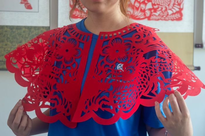 劉老師向同學們展示了珍藏的剪紙作品,包括已故剪紙大師庫淑蘭的代表作。這些作品構圖精巧,線條流暢,讓同學們嘆為觀止。更令人驚喜的是,團隊成員有幸試穿了劉老師制作的融合剪紙元素的絨布云肩,這些創新作品展現了傳統藝術的現代表達。