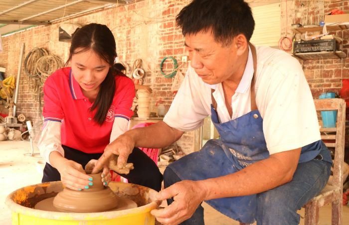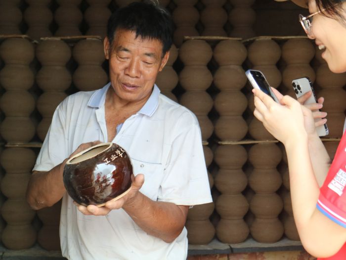 在高州鎮江鎮官沖村的山間,窯煙裊裊中藏著千年陶藝的密碼。“拇指要頂住內側,力道要像給嬰兒拍嗝一樣輕”。非遺傳承人馮太有的巧手在泥坯上流轉,1-2米深層的“土中精華”,在他掌心蛻變為器。一旁,廣東石油化工學院“晶彩陶緣”實踐團的成員們正舉著手機直播,鏡頭里,老師傅的指尖技藝與年輕人的手忙腳亂形成奇妙碰撞。實踐團成員們贊嘆不斷:“原來泥土能這么神奇!”