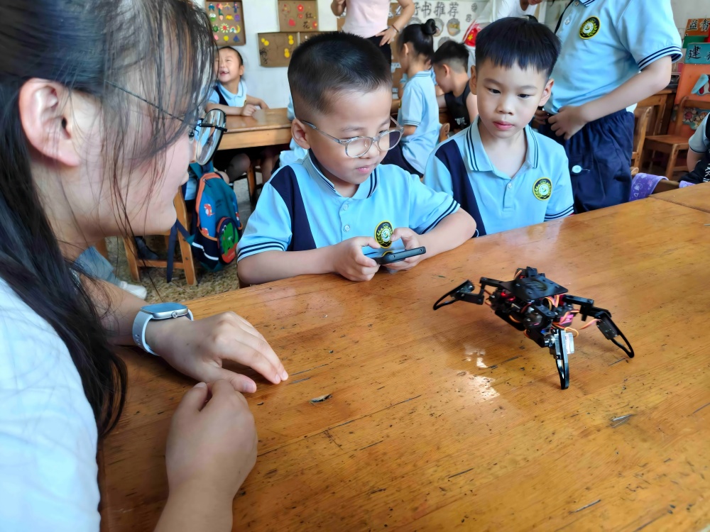 在志愿者的指導下,孩子們小心翼翼地操控著機器人,看著機器人完成前進、轉彎等動作,教室里不時響起陣陣歡呼。“我以后也要造機器人!”許多孩子在成功操控機器人后,眼神里充滿了興奮,說出了未來美好的期盼。