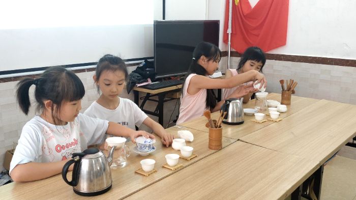結營儀式開場,清幽茶香點亮氛圍。小朋友端坐茶席,洗茶專注、注水平穩、奉茶恭敬,一招一式盡顯認真。初學時他們對茶藝一知半解,如今已能流暢完成整套流程。溫茶入杯,孩童身影藏傳統文化生動模樣,茶香里,文化種子于夏萌芽扎根。