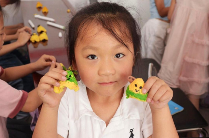 (圖為孩子展示自己的手工作品。)