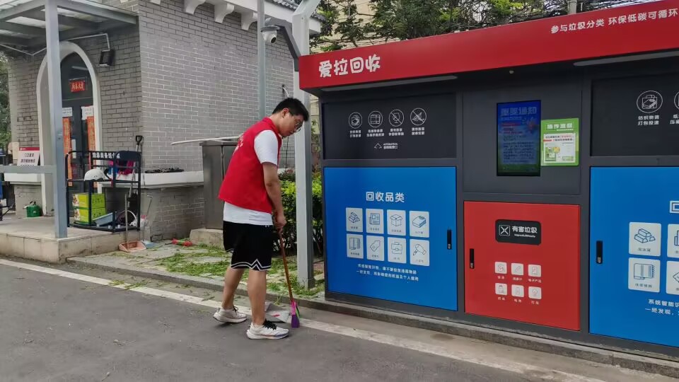 志愿者在街道社區,協助清潔工打掃地面 劉嘉峻 供圖