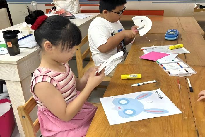 手工環(huán)節(jié)成了想象力的秀場(chǎng)。志愿者先示范如何將紙盤剪出合適的眼部輪廓,再手把手教大家用彩筆勾勒動(dòng)物特征:“給小熊涂棕色時(shí),別忘了它圓滾滾的肚子哦!”孩子們卻不滿足于“標(biāo)準(zhǔn)答案”——有的給熊貓面具加了粉色腮紅,說這是“害羞的熊貓寶寶”;有的用銀色亮片裝飾小鹿的角,聲稱是“會(huì)發(fā)光的魔法鹿”;還有個(gè)小男孩把紙盤對(duì)折,粘上螺旋狀卡紙,得意地宣布:“這是獨(dú)角獸,它會(huì)噴火!”