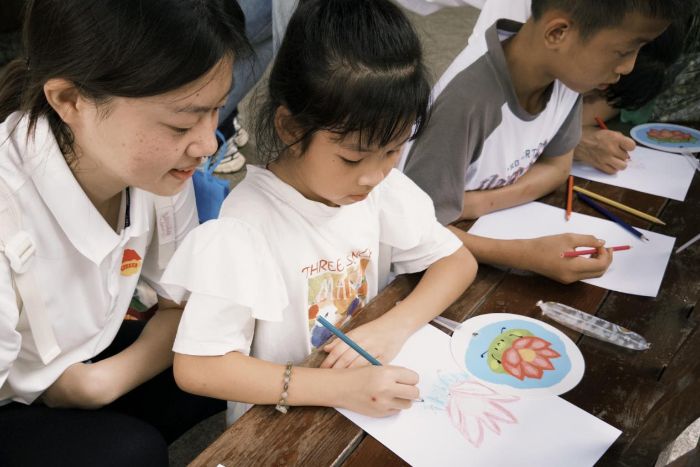 實踐團成員與小朋友們進行廉潔課堂繪畫(黃禾茵攝)