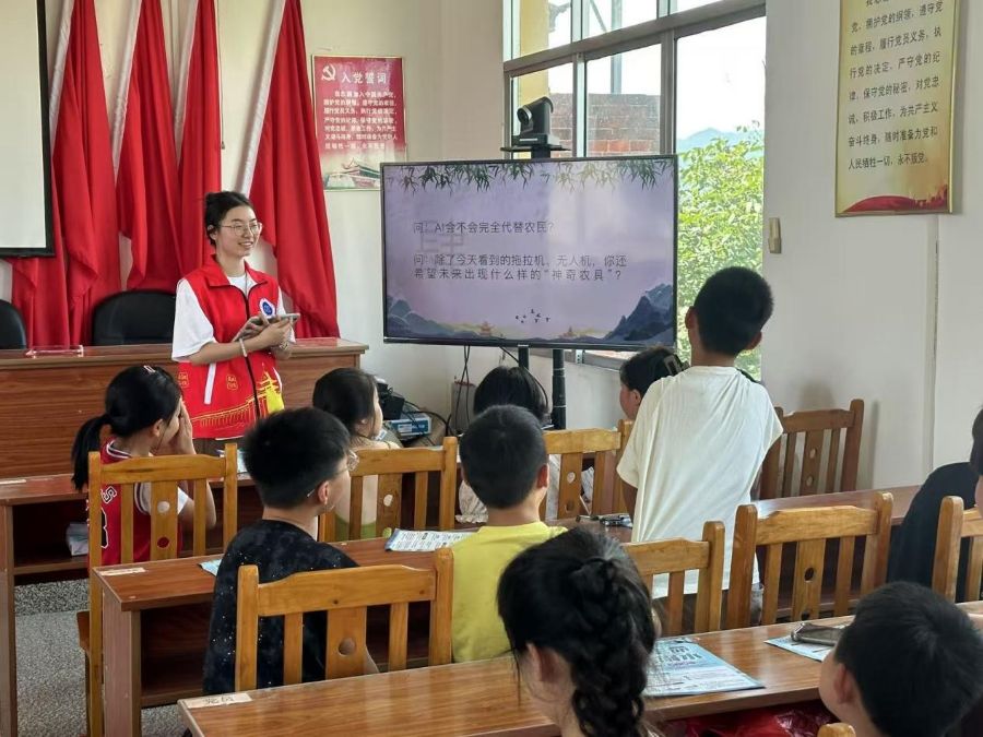 7月27日,實踐團在溈濱村委為當(dāng)?shù)貎和脑O(shè)計了一場融合科技與語言的互動課堂。成員們以生動動畫演示開啟人工智能啟蒙課,闡釋AI基礎(chǔ)概念及其在生活中的廣泛應(yīng)用,特別結(jié)合智慧收割機、無人機精準播種等實例,直觀展示了智能農(nóng)裝如何變革傳統(tǒng)農(nóng)耕方式。在講解過程中,孩子們踴躍分享了自己在日常生活中見過的智能農(nóng)機具,充分展現(xiàn)了當(dāng)代鄉(xiāng)村青少年對農(nóng)業(yè)科技發(fā)展的濃厚興趣,還反映出科技啟蒙教育在鄉(xiāng)村的潛在需求。