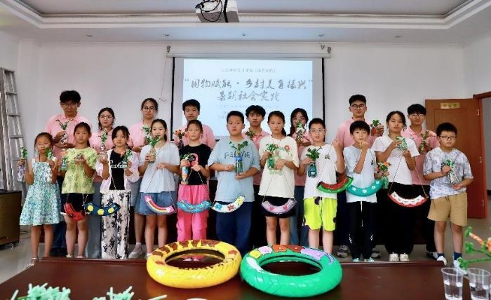 聚焦 “舊物新生” 主題。實踐隊與鎮江市黃墟小學的 10 名學生開展活動。隊員們提前準備了玻璃瓶、廢舊輪胎、顏料、扭扭棒等材料,引導孩子們發揮想象:有的在瓶身繪制鄉村風光,有的則在輪胎上畫出動植物,甚至把心里的童話世界都畫出來!經過一個半小時創作,原本閑置的玻璃瓶變成了色彩斑斕的 “花瓶”,插上扭扭棒花朵后,更顯童趣與創意。