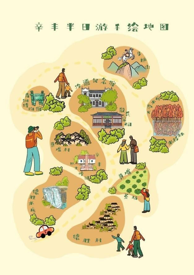 “藝塑” 鄉韻舊物新生鄉村振興賦能團選取德勝村、調研地點及其周邊著名景點,以衛星圖作為參考繪制出了“辛豐半日游手繪地圖”。