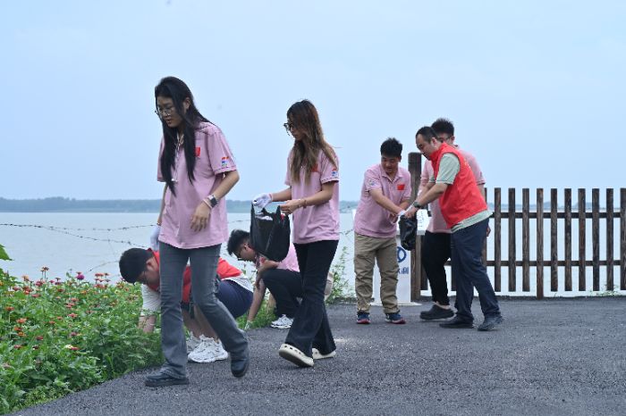 “護湖小隊”集結于龍鳳湖濕地自然保護區入口。經過簡短的任務分配與安全提示后,隊員們佩戴手套、手持垃圾袋,沿湖岸線展開“拉網式”清理。從親水平臺的塑料瓶、棧道縫隙中的食品包裝袋,到蘆葦叢里隱藏的煙頭等雜物,都被一一“收入袋中”。行動中,隊員們分工明確:有的負責重點區域垃圾撿拾,有的專注于垃圾分類打包,還有的主動向駐足游客講解湖泊生態保護的重要性,呼吁“無痕游覽”。