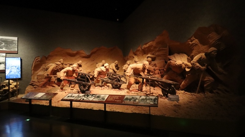 “人民的勝利”以浮雕與文字相結合的方式呈現戰役結果;烈士英名錄墻則通過密集排列的姓名,形成數量上的直觀沖擊。展柜中的文物史料按照時間軸與戰役階段分區陳列,其中包括運輸小車、彈藥箱、軍裝殘片等實物,輔以戰役態勢電子沙盤、沉浸式影像等多媒體手段,再現戰場環境。展品說明牌引用了