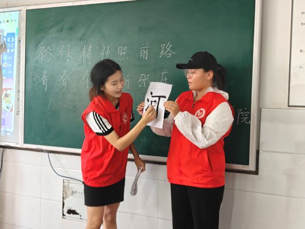 抵達蘭考張莊后,隊員們首先去到了張莊小學,并為張莊小學的孩子們精心準備了科普、書法、足球等課程。隊員們通過游戲、問答等生動形象的課堂形式,進行了科學知識的科普,帶孩子們領略了漢字書法的獨特魅力,并帶領孩子們學習足球知識、享受運動的快樂。同時,隊員們積極宣傳國家資助政策,通過趣味活動推廣普通話,并捐贈足球、籃球及書本,豐富孩子們的課余生活,為鄉村教育注入新活力。