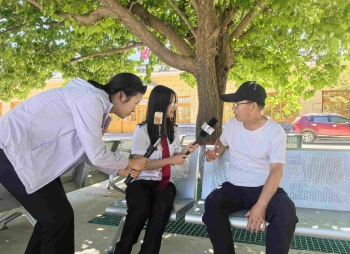 (圖為實踐隊成員高默涵采訪第二代治沙人程生學(xué))