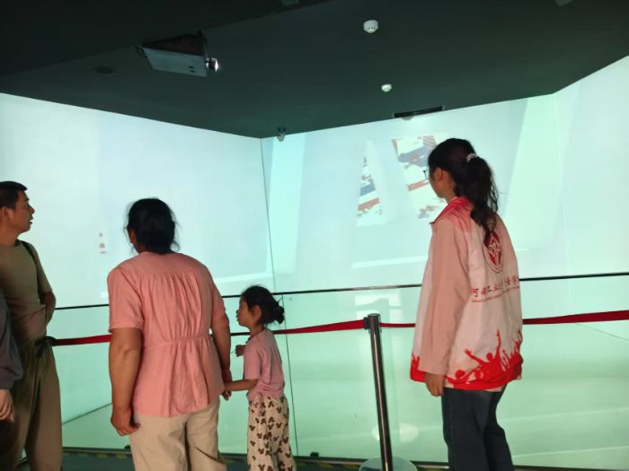 接著,小組的腳步轉(zhuǎn)向了二七塔,二七紀(jì)念塔矗立于鄭州二七廣場,其雙塔并肩的獨(dú)特造型,宛如凝固的史詩,無聲訴說著那段波瀾壯闊的歷史。實(shí)踐小組成員懷著崇敬的心情步入塔內(nèi),在講解員的引導(dǎo)下,開啟了這場紅色之旅。塔內(nèi)各層展覽以豐富多樣的形式呈現(xiàn)歷史:泛黃的老照片記錄下京漢鐵路工人大罷工的珍貴瞬間;銹跡斑斑的革命物件承載著先輩們的不屈意志;逼真的場景復(fù)原生動(dòng)再現(xiàn)了工人階級(jí)團(tuán)結(jié)抗?fàn)幍恼鸷硤雒妗T诙咚牡谒膶?ldquo;共生”,實(shí)踐團(tuán)隊(duì)觀看了展示鄭州這座城市發(fā)展與變遷的視頻。梁文燦和單思佳正全神貫注地盯著放映的視頻,認(rèn)真聽著視頻里的介紹,她們對(duì)鄭州的歷史有了更深刻的了解。