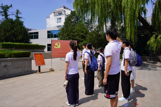 中國青年網通訊員 賀文博 攝在紀念館外,實踐團成員學習入黨誓詞。面向黨旗,同學們舉起右拳,鄭重宣誓,誓言鏗鏘,擲地有聲,宣示堅定的政治信念,做出莊嚴的履職承諾,展現了當代大學生永跟黨走,拼搏奮斗不息的不懈追求。