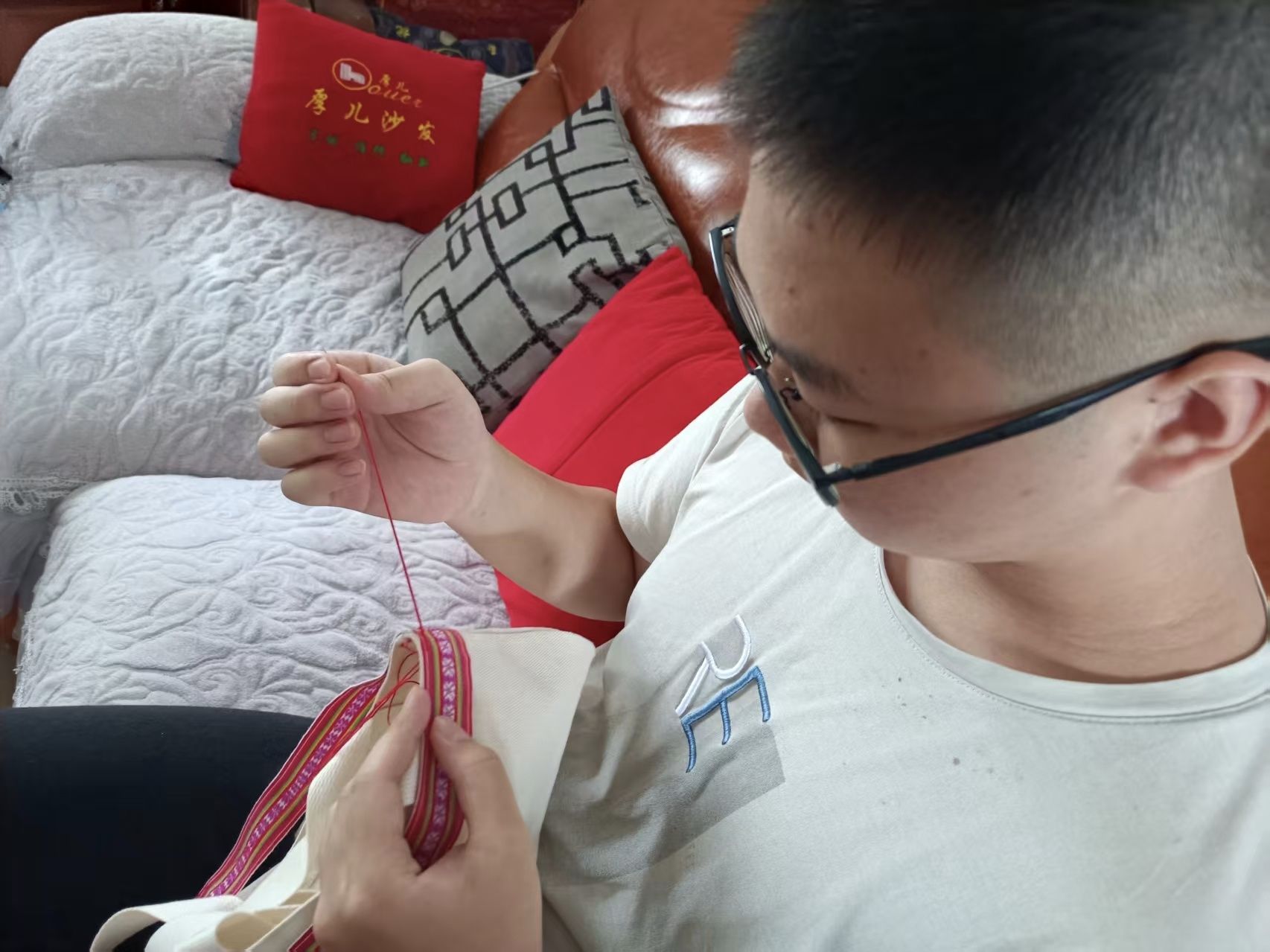 圖為團隊成員制作藍巾帕文創(chuàng)手提袋實物產(chǎn)品。 劉文森攝