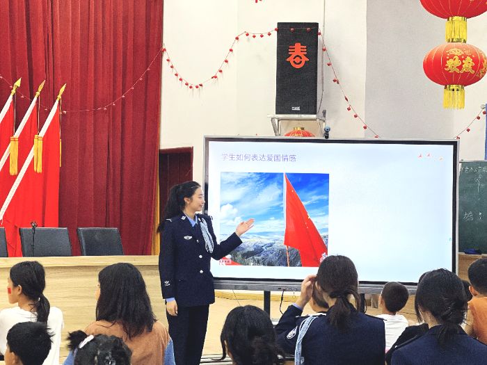 國家象征是公民責任的起點。隊員高羽迪與雍秦勤共同開展國旗、國歌、國徽知識宣講,從國旗的五星設計寓意、國歌《義勇軍進行曲》的創作背景,到國徽上谷穗、齒輪的象征內涵,再到日常使用中的禮儀規范,二人用通俗語言系統講解,讓孩子們不僅認識國家象征的歷史意義與法律規定,更樹立起 “維護國家象征尊嚴” 的公民意識。