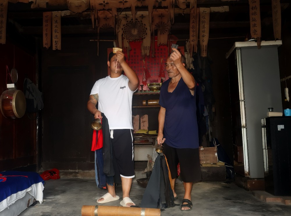 不過,希望正悄然萌芽。近年來,政府加大了對非物質文化遺產的保護力度,高校團隊也頻繁來訪調研,這讓石進榮、龍金茂兩位師傅倍感欣慰。“你們能來記錄巴代文化,就是在幫它活下去。” 石進榮師傅特意穿上紅色法袍,為實踐團展示了巴代祭祀時的綹巾舞。清脆的司刀聲在樓間回蕩,仿佛一場穿越時空的對話。