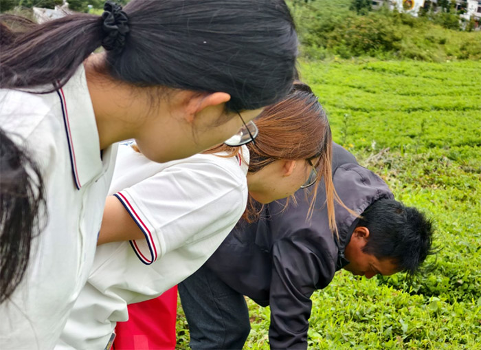 (圖為在黨參基地工作的阿姨向團隊成員演視黨參的基本種植方法。甘蓉蓉供圖)