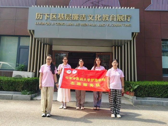 圖為山東中醫藥大學護理學院志愿服務隊在歷下區基層廉潔文化教育展廳前合影