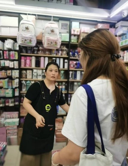 圖為實踐隊員與一次性衛生用品店主交流訪談。通訊員 張美琪 供圖