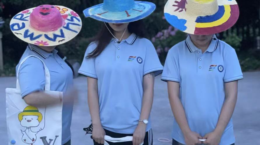 三位身著統一服裝的實踐隊員,頭戴色彩繽紛、創意繪制的草帽,青春洋溢