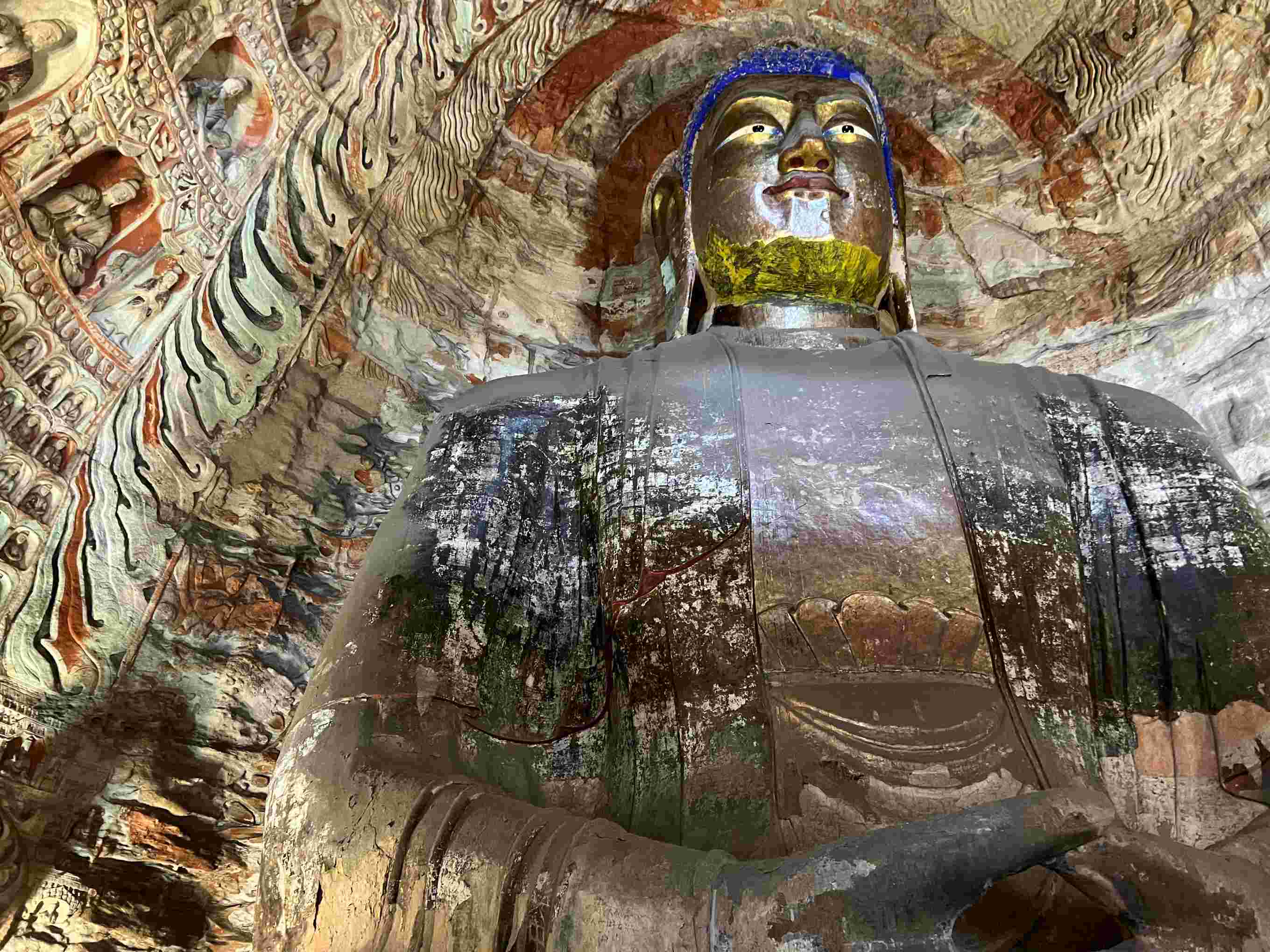步入石窟景區,實踐團成員無不被眼前宏偉壯麗的景象所震撼。依山開鑿的窟龕綿延不絕,一尊尊佛像莊嚴靜穆,精美的浮雕栩栩如生。從早期雄健渾厚的曇曜五窟,到中期富麗堂皇的雙窟,再到后期秀骨清像的造像風格,跨越時空的藝術對話讓同學們深切感受到了古代工匠高超的技藝、非凡的智慧以及北魏時期的文化交融與宗教虔誠。手指輕觸歲月打磨的巖壁,仿佛能聆聽到歷史的回響,民族自豪感與文化自信油然而生。