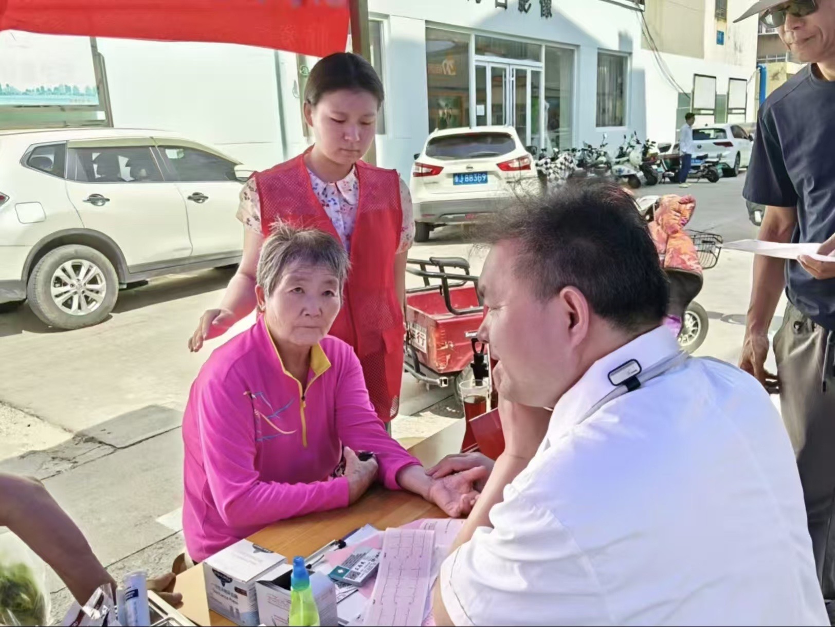 體檢工作上成員協助醫務工作者進行血壓、血糖、心電圖等項目的檢查并在旁為前來檢查的老人記下檢查數據,在雙方的相互配合下,為社區老人的身體健康提供了安全保障。