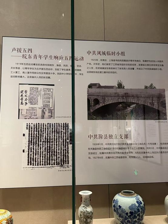“中共早期活動(dòng)” 展板,講述了滁州傳播馬克思主義、建立黨組織的歷程,從中共鳳城臨時(shí)小組到滁縣獨(dú)立支部,革命火種在這片土地逐漸燃起 。