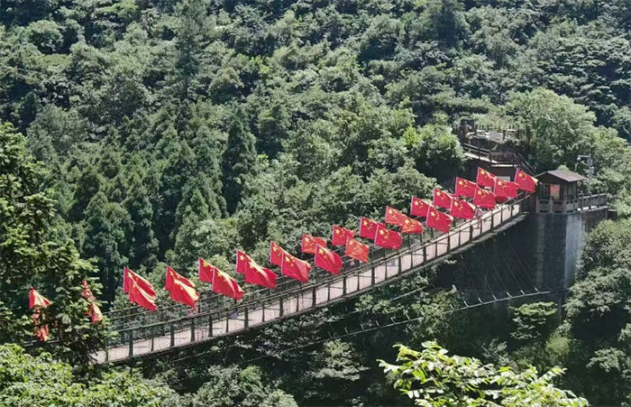長空橋:紅旗獵獵的初心回響 橫跨深澗的吊橋上,紅旗在山風里狂舞,拍打欄桿的“啪啪”聲驚起了樹梢的山雀。橋板縫隙間,能看見谷底溪流奔涌,蒸騰的水霧里,吊橋如同一根飄搖的紅線,串聯起兩岸的蒼翠。
