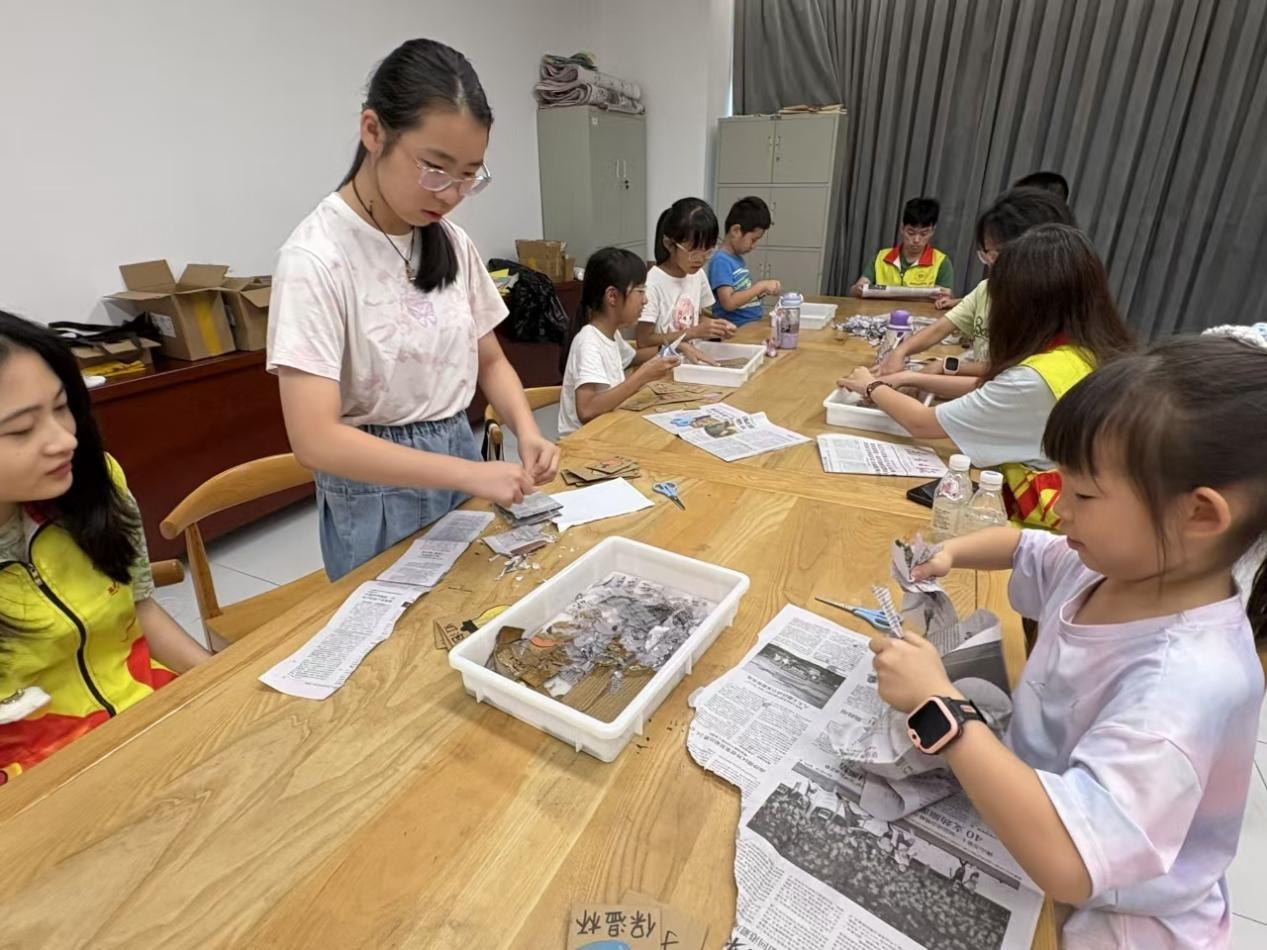 志愿者團隊還將環保與非遺結合,講解四大發明之一的造紙術,并介紹和平縣本土的“陽明紙”歷史。孩子們將前幾日廢棄的報紙、卡紙撕碎、打漿,親手體驗“廢紙再生”,最終制成環保書簽。非遺智慧與現代環保理念的融合實踐,促進和平縣的年輕一代真切感受到個人行動與社會生態的緊密聯系。