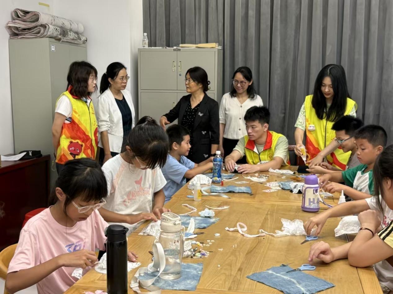 隨后,團隊帶領孩子們體驗了當地省級非遺項目“墩頭藍扎染”。墩頭藍紡織技藝在2015年被列為第六批廣東省級非物質文化遺產項目,該技藝以棉麻為原料,成品以色牢度高、耐磨性強著稱。在志愿者的科普下,孩子們對本土的墩頭藍非遺紡織技藝有了初步的了解,并將棉麻布經過捆扎、浸染、晾曬,化作一幅幅藍白相間的獨特圖案。同時,孩子們在扎染課程上完成的布藝作品也被應用在了下午的禮帽創意制作中,實現了當地非遺“文化認知—創意實踐—成果應用”的閉環。