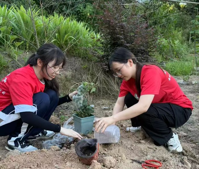 7月4日,實踐團隊在當地農技人員的指導下,在富堨鎮德和山莊開展環境整治與景觀營造工作,以山莊生態微景觀提質為出發點進行民宿品質提升。烈日下,隊員們揮鍬鏟土、俯身栽苗,額頭上的汗珠與沾滿泥土的雙手,成為青春最美的勛章。